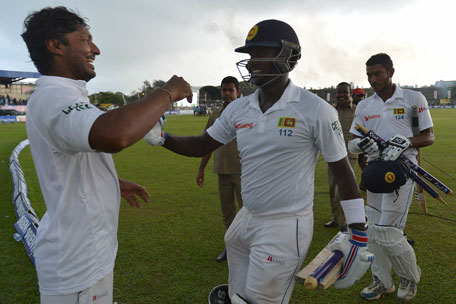 Sri Lankan cricket team captain Angelo Mathews (captain) and teammate Kumar Sangakkara celebrate after winning the opening Test match between Sri Lanka and Pakistan at the Galle International Cricket Stadium in Galle on August 10, 2014. (AFP)