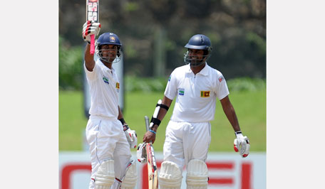 Sri Lanka 1st innings 570-4 decl (L. Thirimanne 155 not out, K. Sangakkara 142, D. Chandimal 116 not out; Sohag Gazi 3-164)