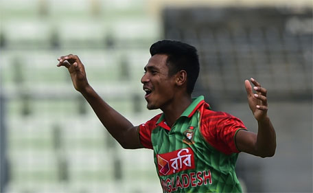 Bangladesh bowler Mustafizur Rahman reacts after the dismissal of the South Africa's Quinton de Kock during the second ODI at the Sher-e-Bangla National Cricket Stadium in Dhaka on July 12, 2015. (AFP)