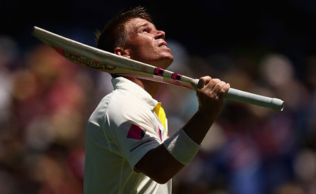 David Warner of Australia looks to the sky as he walks off the field after being dismissed by Ravichandran Ashwin of India during day one of the fourth Test between Australia and India at Sydney Cricket Ground on January 6, 2015 in Sydney, Australia. (Getty)