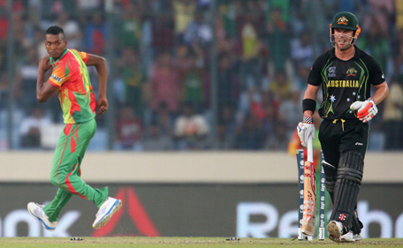 Al-Amin Hossain (left) of Bangladesh celebrates after dismssing David Warner during the ICC World Twenty20 Bangladesh 2014 match between Bangladesh and Australia at Sher-e-Bangla Mirpur Stadium on April 1, 2014 in Dhaka, Bangladesh. (Getty)