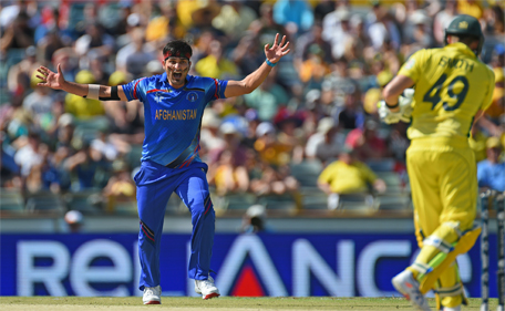 Afghanistan's Hamid Hassan (left) makes an unsuccessful appeal against Australia's Steven Smith during the 2015 Cricket World Cup Pool A match between Australia and Afghanistan in Perth on March 4, 2015. (AFP)