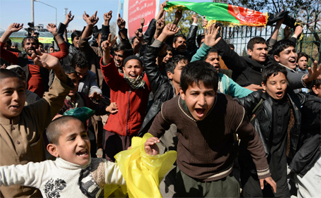 Afghan cricket fans watch the live television broadcast of their national cricket team victory in the World Cup 2015 match between Afghanistan and Scotland, in Jalalabad capital of Nangarhar province on February 26, 2015. (AFP)