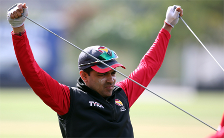 UAE cricketer Khurram Khan warms up during training ahead of their 2015 Cricket World Cup Group B match against Pakistan in Napier on March 3, 2015. (AFP)