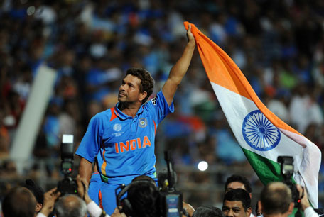 Indian cricketer Sachin Tendulkar waves the Indian flag as he celebrates his team's victory during the ICC Cricket World Cup final match between India and Sri Lanka at The Wankhede Stadium in Mumbai. (AFP)