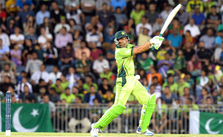 Pakistan batsman Younis Khan plays a shot during a one-day international 2015 World Cup warm-up cricket match between Pakistan and Bangladesh at Blacktown Sports Park in Sydney on February 9, 2015. (AFP)