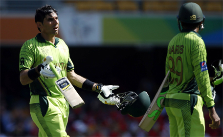 Pakistan's captain Misbah-ul-Haq (left) reacts as he takes a break with team mate Haris Sohail during their Cricket World Cup match against Zimbabwe at the Gabba in Brisbane March 1, 2015. (Reuters)