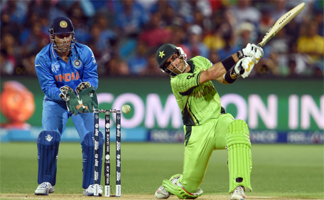 Pakistan batsman Misbah-ul-Haq (right) plays a shot as Indian captain Mahendra Singh Dhoni looks on during their 2015 Cricket World Cup match in Adelaide on February 15, 2015. (AFP)