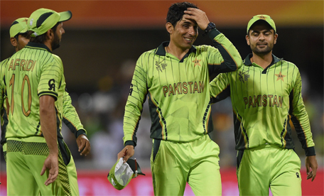 Pakistan cricketers (from left) Haris Sohail, Shahid Afridi, Misbah-ul Haq and Ahmad Shehzad walk back after winning the 2015 Cricket World Cup Pool B match between Pakistan and Zimbabwe at the Gabba Stadium in Brisbane on March 1, 2015. (AFP)