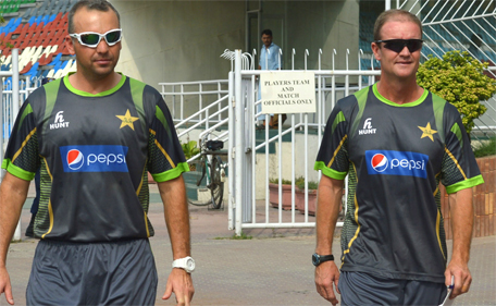 In this photograph taken on July 18, 2014, Pakistani cricket team batting coach Grant Flower (right) arrives with fielding coach Grant Luden (left) for a news conference in Lahore. (AFP)