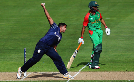 Majid Haq of Scotland bowls during the 2015 ICC Cricket World Cup match between Bangladesh and Scotland at Saxton Field on March 5, 2015 in Nelson, New Zealand. (Getty Images)