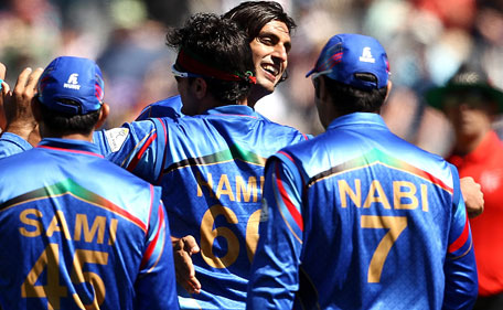Shapoor Zadran (centre) of Afghanistan celebrates with team mates during the 2015 ICC Cricket World Cup match between Afghanistan and Scotland at University Oval on February 26, 2015 in Dunedin, New Zealand. (Getty)