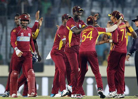 West Indies' players celebrate their victory against Pakistan after their ICC Twenty20 World Cup match at the Sher-E-Bangla National Cricket Stadium in Dhaka April 1, 2014. (REUTERS)