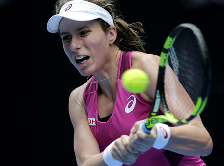The 47th-ranked Konta battled nerves and a wayward serve at times but overpowered the 133rd-ranked Zhang from the baseline to wrap up the match in one hour and 23 minutes on a warm, sunny afternoon at Rod Laver Arena.