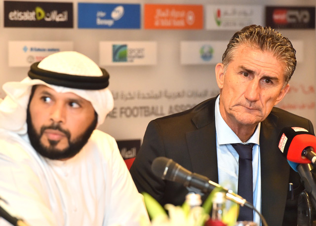 Edgardo Bauza (R), the new Argentinian coach of UAE's national team gives a press conference with the President of UAE Football Association Marwan bin Ghalaita following the announcement of his appointment in Dubai. (AFP)