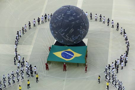 An actor performs during the opening ceremony of the 2014 World Cup at Itaquerao Stadium before the group A soccer match between Brazil and Croatia, the opening game in the tournament, in Sao Paulo, Brazil. (AP)