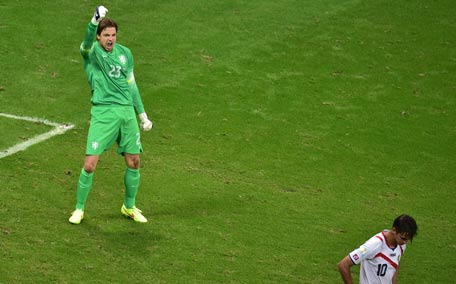 Netherlands' goalkeeper Tim Krul (L) celebrates after making a save from Costa Rica's forward and captain Bryan Ruiz (R) during the penalty shout out of a quarter-final football match between Netherlands and Costa Rica at the Fonte Nova Arena in Salvador during the 2014 FIFA World Cup. (AFP)
