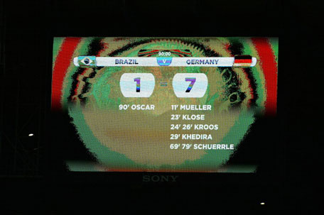 Brazil 1 (Oscar 90") Germany 7 (Mueller 11" Klose 22" Kroos 24", 26" Khedira 29" Schuerrle 69" 79")