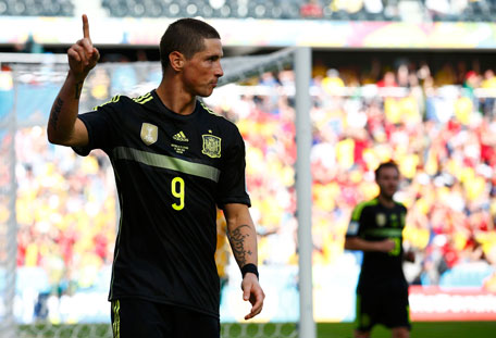 Spain's Fernando Torres celebrates after scoring a goal during the 2014 World Cup Group B soccer match between Australia and Spain at the Baixada arena in Curitiba June 23, 2014. (REUTERS)