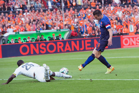 Robin van Persie of the Netherlands scores against Ghana during their international soccer friendly in Rotterdam May 31, 2014. (REUTERS)
