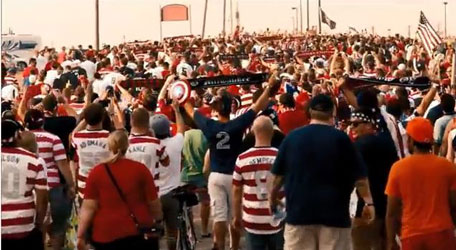 It's been promoted by ESPN and the American Outlaws supporters group and has been very loud at the World Cup grounds when the US. is playing. The message may be a bit plain, but repeated over and over with a steady rhythm, the chant becomes infectious, particularly when accompanied by samba drums.