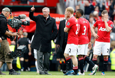 Manchester United's manager Alex Ferguson sends his team to thank the crowd after their English Premier League match against Swansea City at Old Trafford in Manchester, England, on Sunday. (REUTERS)