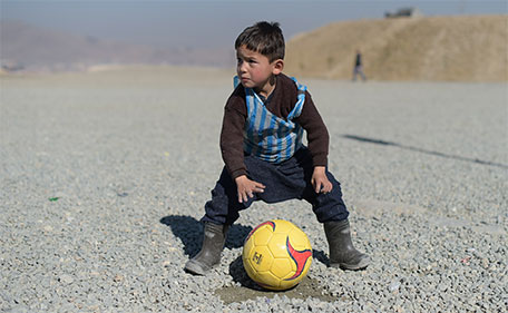 Afghan boy five-year-old Murtaza Ahmadi, a young Lionel Messi fan, plays football in Kabul on February 1, 2016. (AFP)