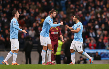 Sergio Aguero (right) of Manchester City celebrates with Edin Dzeko after scoring his first goal during the FA Cup fourth round match between Manchester City and Watford at Etihad Stadium on January 25, 2014 in Manchester, England. (GETTY)