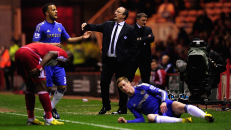 Chelsea manager Rafa Benitez (centre) reacts as forward Fernando Torres (right) ends up on the floor after a challenge during the FA Cup fifth round match against Middlesbrough at Riverside Stadium on February 27, 2013 in Middlesbrough, England. (GETTY)