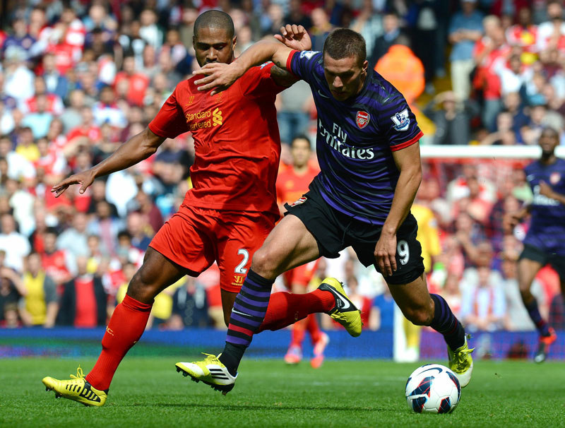 Arsenal's German forward Lukas Podolski (R) vies with Liverpool's English defender Glen Johnson during the English Premier League football match between Liverpool and Arsenal at Anfield in Liverpool, north-west England on September 2. (AFP)