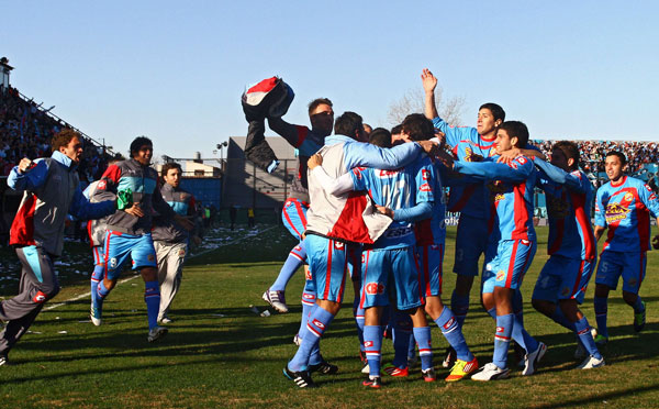 Arsenal's players celebrate after Lisandro Lopez's goal against Belgrano during their Argentina First Division football match in Buenos Aires, on June 24, 2012. Arsenal won by 1-0 and became champion. (AFP)