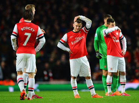Jack Wilshere (centre) of Arsenal reacts during the Barclays Premier League match between Arsenal and Manchester United at the Emirates Stadium on February 12, 2014 in London, England. (GETTY)