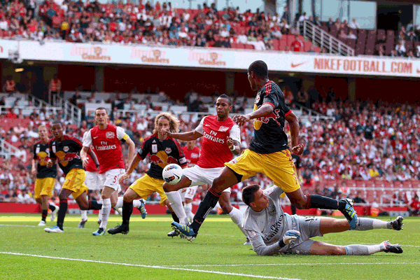 Kyle Bartley (centre) of Arsenal scores an own goal during the Emirates Cup match against New York Red Bulls at the Emirates Stadium on Sunday in London, England. (GETTY)