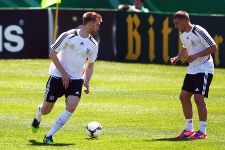 Arsenal team mates Per Mertesacker (left) and Lukas Podolski exercise during a Germany training session at Campo Sportivo Comunale Andrea Dora on Saturday in Abbiadori, Italy. (GETTY)