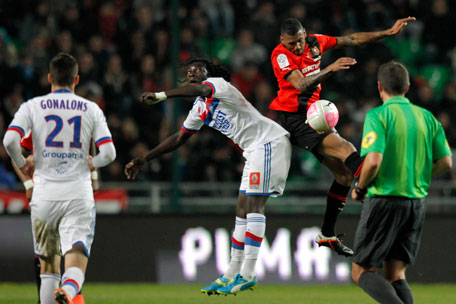 Yann M'Vila (right) of Stade Rennes challenges Olympique Lyon's Bafetimbi Gomis (centre) during their French Ligue 1 match at the Route de Lorient stadium in Rennes on Sunday. (REUTERS)