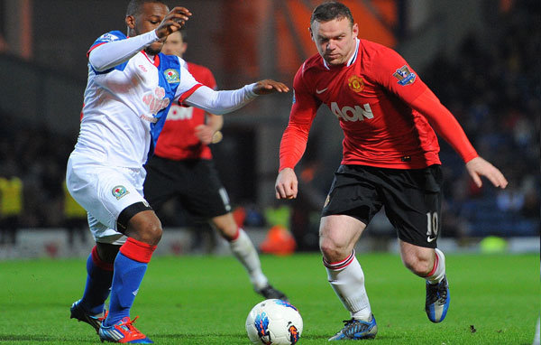 Manchester United's English forward Wayne Rooney (R) vies with Blackburn Rovers' Canadian forward David Hoilett during the English Premier League football match between Blackburn Rovers and Manchester United at Ewood Park, Blackburn, north-west England on April 2 2012. (AFP)
