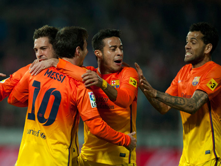 FC Barcelona's Lionel Messi from Argentina, second left, celebrates his goal with his teammates Jordi Alba, left, Thiago Alcantara, second right, and Daniel Alves, from Brazil, right, during a Spanish La Liga soccer match at Los Carmenes stadium in Granada, Spain, Saturday, Feb. 16, 2013. (AP)