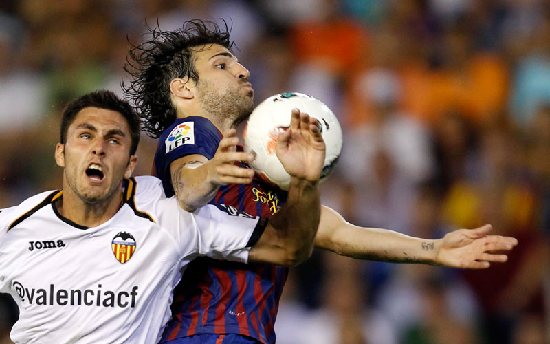 Barcelona's Cesc Fabregas, background, duels for the ball with Valencia's Victor Ruiz, left, during their La Liga soccer match at Mestalla stadium in Valencia, Spain.(AP)