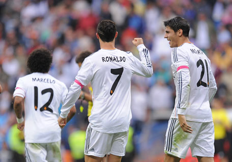Cristiano Ronaldo (centre) of Real Madrid CF celebrates with Alvaro Morata after scoring Real's second goal from the penalty spot during the La Liga match against Malaga CF at the Santiago Bernabeu stadium on October 19, 2013 in Madrid, Spain. (GETTY)