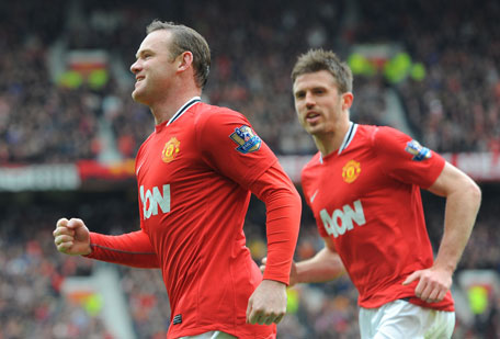 Manchester United's Wayne Rooney (left) celebrates with teammate Michael Carrick after scoring the opening goal during the English Premier League match against Queens Park Rangers at Old Trafford on Sunday. (AFP)