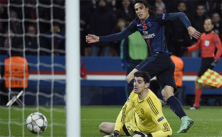 Paris Saint-Germain's Uruguayan forward Edinson Cavani scores a goal past Chelsea's Belgian goalkeeper Thibaut Courtois during the Champions League round of 16 first leg football match between Paris Saint-Germain (PSG) and Chelsea FC on February 16, 2016, at the Parc des Princes stadium in Paris. (AFP)