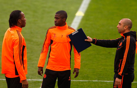 Chelsea manager Robert Di Matteo talks to Ramires (centre) and Didier Drogba during a team training session at Camp Nou stadium in Barcelona on Monday, before their Champions League semi-final second leg match against Barcelona on Tuesday. (REUTERS)