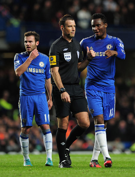Mikel of Chelsea talks to referee Mark Clattenburg as team mate Juan Mata looks on during the Barclays Premier League match against Manchester United at Stamford Bridge on October 28, 2012 in London, England. (GETTY)