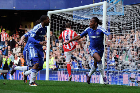 Chelsea's Didier Drogba (right) celebrates after scoring against Stoke City during their English Premier League soccer match at Stamford Bridge in London on Saturday. (REUTERS)