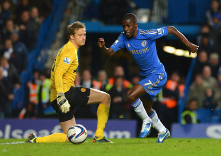 Ramires of Chelsea goes past goalkeeper Anders Lindegaard of Manchester United to score his goal during the Capital One Cup fourth round match at Stamford Bridge on October 31, 2012 in London, England. (GETTY)