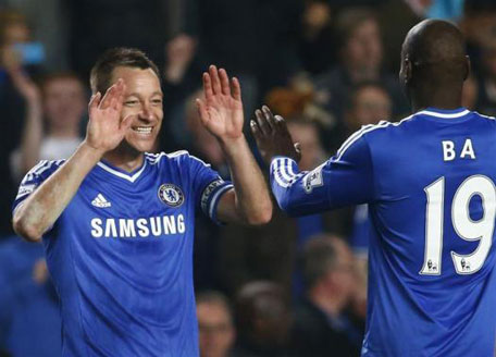 Chelsea's John Terry (left) celebrates with Demba Ba after defeating Tottenham Hotspur in their English Premier League match at Stamford Bridge in London March 8, 2014. (REUTERS)