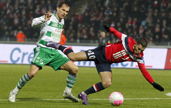 Lille's Eden Hazard falls as he challenges Saint Etienne's Sylvain Marchal during their French Ligue 1 soccer match at Lille Metropole Stadium in Villeneuve d'Ascq near Lille January 28, 2012. (REUTERS)