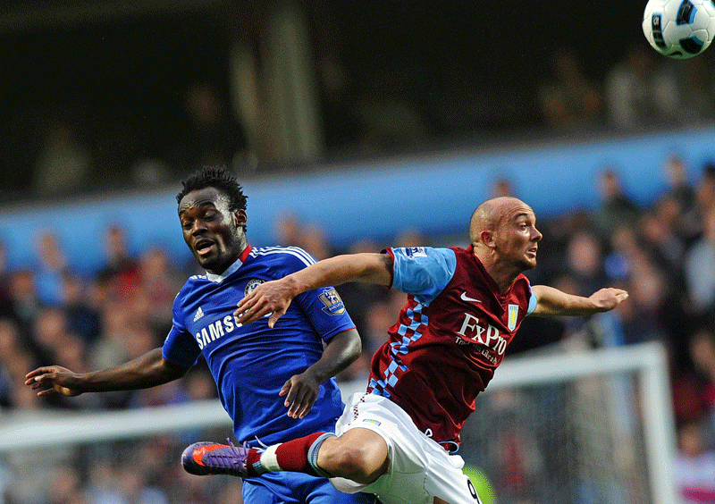 Chelsea’s Michael Essien (left) vies with Aston Villa’s Stephen Ireland during the Premier League match at Villa Park. (AFP)