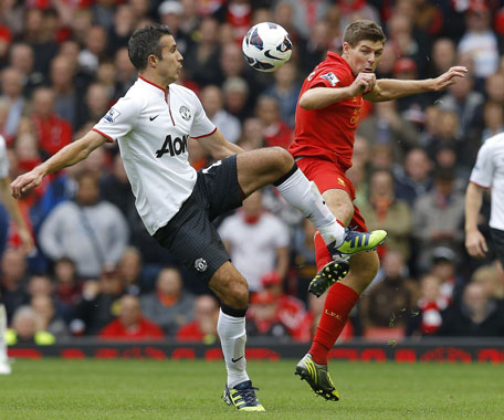 Liverpool's Steven Gerrard (R) challenges Manchester United's Robin van Persie during their English Premier League soccer match at Anfield in Liverpool, northern England September 23, 2012. (REUTERS)