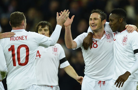 England's striker Wayne Rooney (left) and midfielder Frank Lampard (second right) high-five as they celebrate Lampard's winning goal with Danny Welbeck (right) during the international friendly against Brazil at Wembley Stadium in London on February 6, 2013. (AFP)